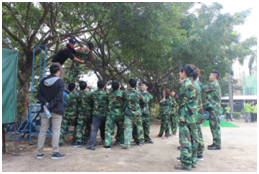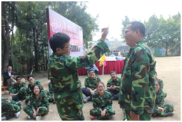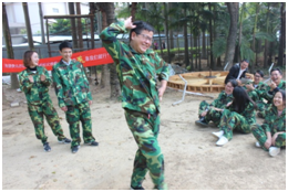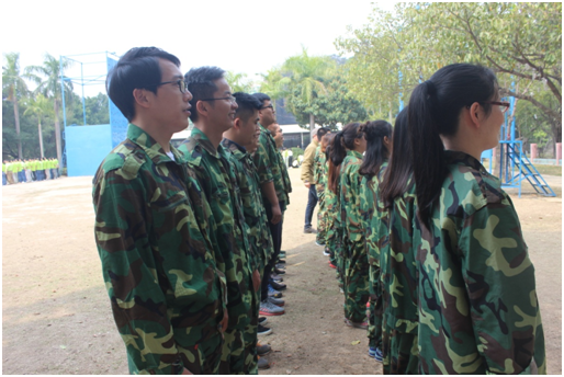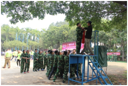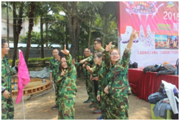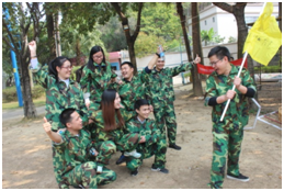 在正式的拓展项目前,教练让大家进行了几个破冰小游戏,旨在攻破人与人之间的隔阂,建立彼此信任的基础,营造团队快乐和谐的氛围。而后,按照教练的教唆,大家随机分成了两个小组,为自己的队伍取名、想口号、编队歌、设计队形、填写队旗。“闪电队”坚持“闪电、闪电,我们最炫”,“飓风队”高喊“飓风出击,所向披靡”,充分体现了两队高涨的热情和取胜的信心。