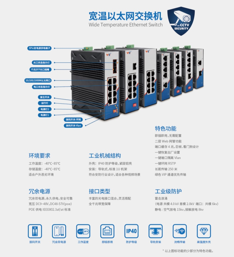 宽温工业以太网交换机:非网管交换机、智能拨码交换机、智能拨码POE交换机、二层网管交换机、二层网管POE交换机、三层网管交换机。