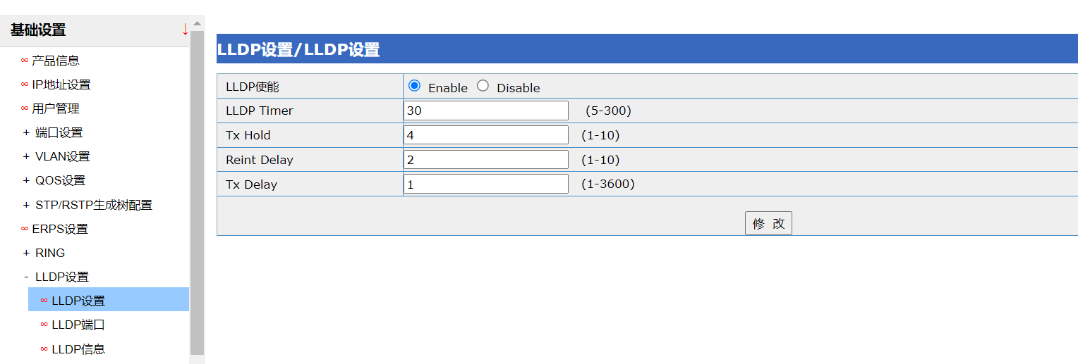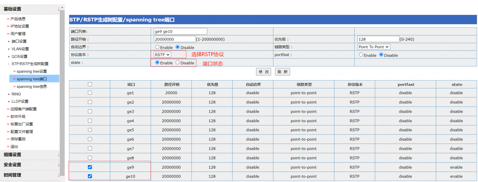 3)现场使用默认都会开启光口环网,勾选ge9-10端口state状态修改为Enable点击修改。
