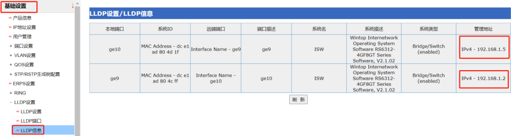2)LLDP信息表内查看光口获取相邻交换机ip