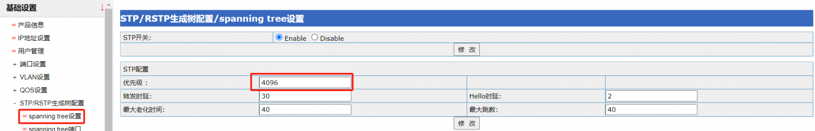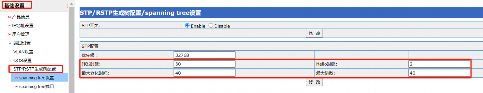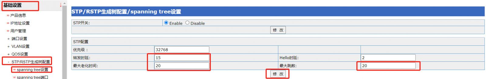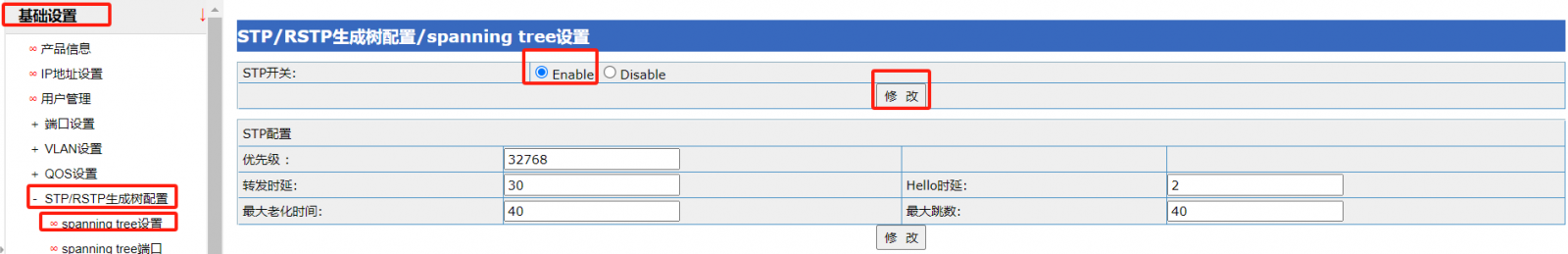 浏览器输入交换机IP登入管理页面,功能选项基础设置/STP/RSTP设置/spanning tree设置/STP开关选择Enable-修改。