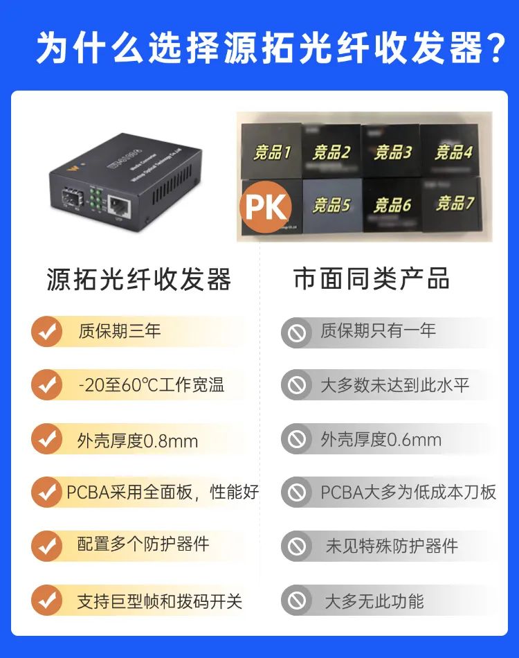 在工业通信设备领域,真正的品质较量往往藏在毫米级的设计细节与纳米级的工艺精度之中。为了全方位、多维度地验证源拓光纤收发器产品的卓越品质,我们开展了一场严谨且深入的竞品分析行动,对比了市场上七家知名品牌的同类产品。通过细致拆解机器,源拓产品在硬件设计(包括创新外壳结构、加厚防护层及高规格PCBA板材)、软件功能完整性、环境适应性(防护等级与宽温工作能力)、售后服务、质保周期以及产品包装防护等六大核心维度均展现出显著优势。