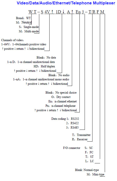 WT fiber-optic video transceivers can simultaneously transmit 64 channels of 8-bit digitally encoded video / return or bidirectional data / unidirectional or bidirectional audio / Ethernet / Telephone / Dry contact over one multimode or single-mode optical fiber.
