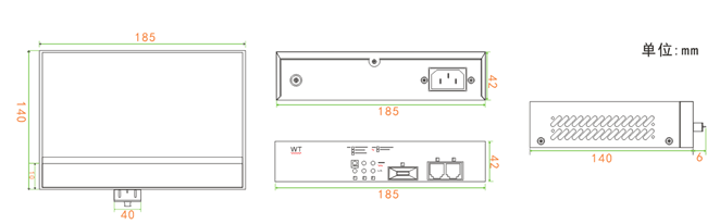 外壳:金属,IP30防护 尺寸 : 185x140x42mm(内置电源)135x122x35mm(外置电源) 重量 :700g 500g 安装方式 :桌面安装,壁挂安装 |