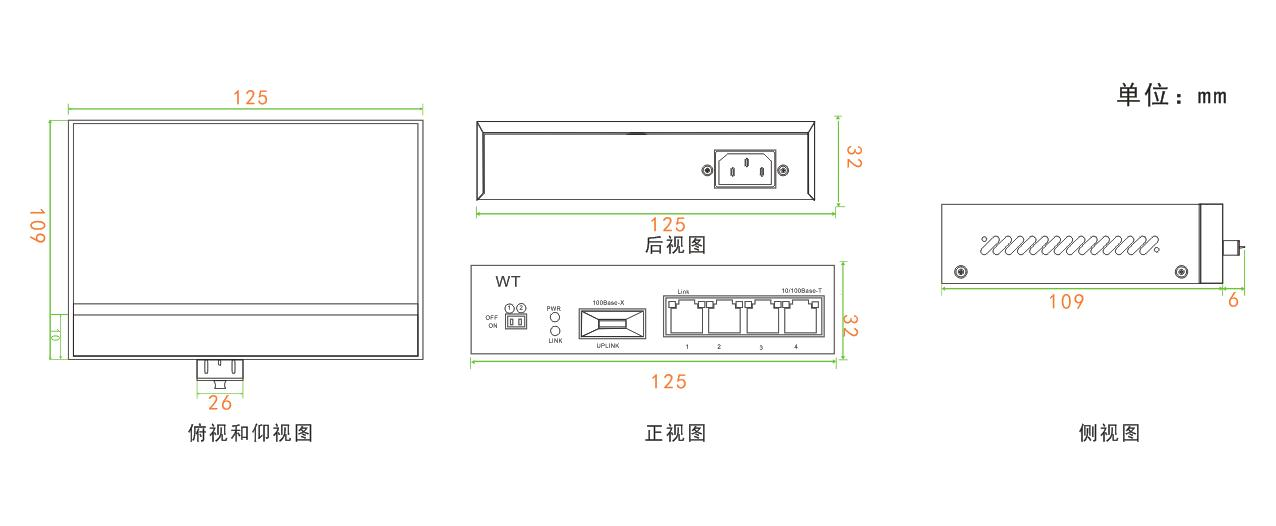 外壳 : 金属,IP30防护 尺寸:125x109 x32mm 重量 : 430g 安装方式 :桌面安装,壁挂安装 |