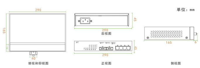 外壳:金属,IP30防护 尺寸 : 290*165*45mm 重量 :1.2kg 安装方式 :桌面安装,壁挂安装 |