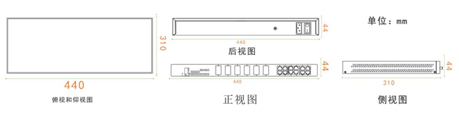 外壳: 金属,IP30防护 尺寸:440mm*310mm*44mm 重量 :3100g 安装方式 :机架式 |