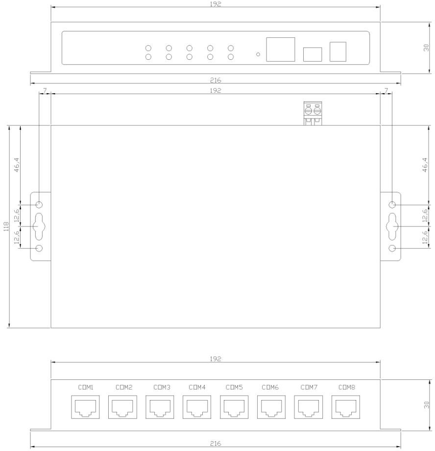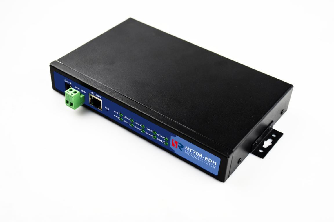 NT708-8DH 为复合型串口服务器,除具备常规串口服务器功能外,还具备 Modbus 网关的功能。能够将8路标准的 RS-232/485 串口信号转换成 TCP/IP 网 络信号,实现 RS-232/485 串口设备与 TCP/IP 网络之间的双向数据透明传输,或根据需要做 ModbusTCP 与 ModbusRTU/ModbusASCII 协议之间的转换。8 路串口服务器模块按照工业级电路设计标准进行设计,工作电压范围宽、抗干扰能力强、防雷击及浪涌冲击,可长期稳定工作。