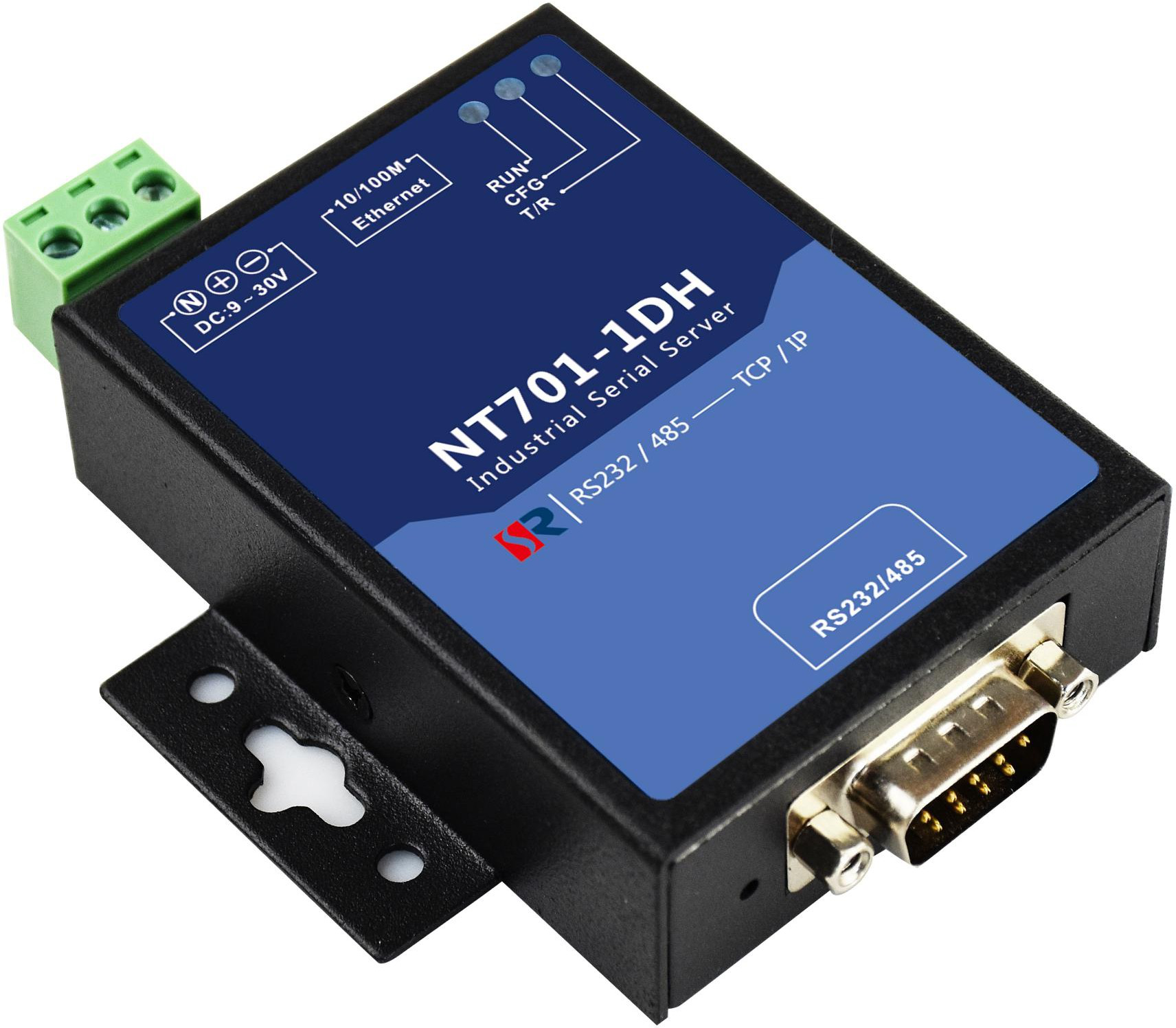 NT701-1DH 为复合型串口服务器,除具备常规串口服务器功能外,还具备 Modbus 网关的功能。能够将一路标准的 RS-232/485 串口信号转换成 TCP/IP 网 络信号,实现 RS-232/485 串口设备与 TCP/IP 网络之间的双向数据透明传输,或 根据需要做 ModbusTCP 与 ModbusRTU/ModbusASCII 协议之间的转换。使得串口设 备能够立即具备 TCP/IP 网络接口功能,连接网络进行数据通信,极大的扩展串 口设备的通信距离。NT701-1DH 串口服务器模块按照工业级电路设计标准进行设 计,工作电压范围宽、抗干扰能力强、防雷击及浪涌冲击,可长期稳定工作。