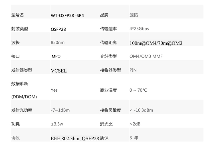 源拓WT-QSFP28-SR4 100G 多模 100米 MPO