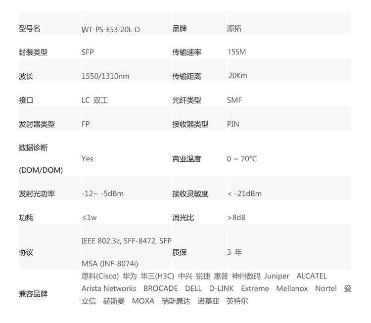 源拓WT-PS-E53-20L-D SFP百兆单模单纤20公里商业级 (1550/1310 )