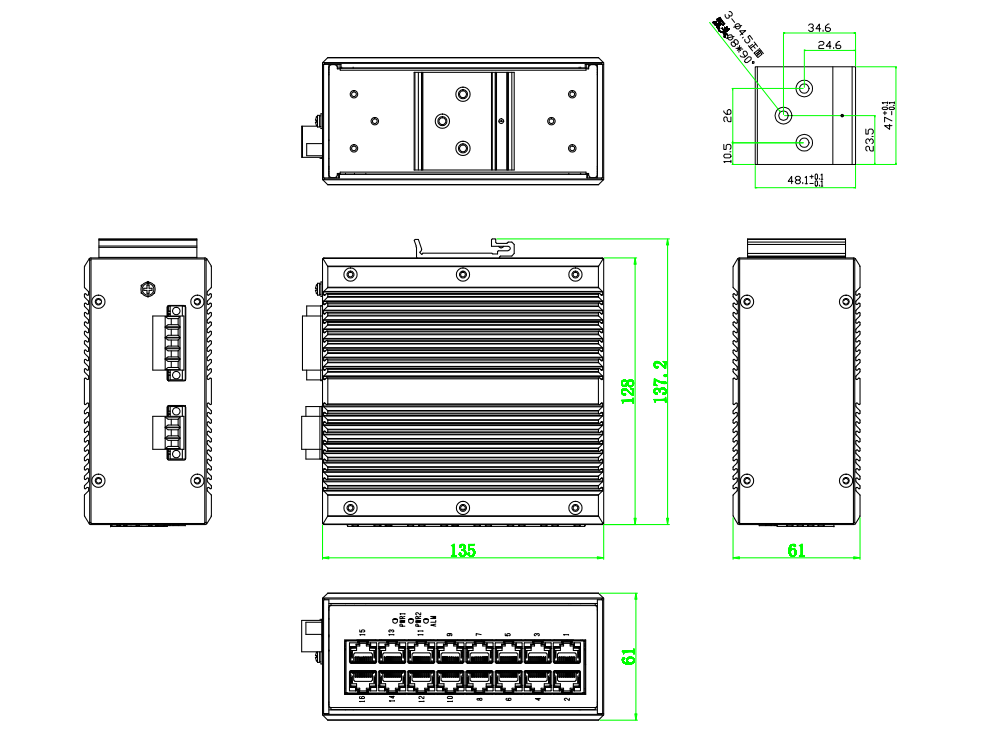 百兆电口 : 10/100Mbps自适应, Full/Half双工模式,支持MDI/MDI-X。