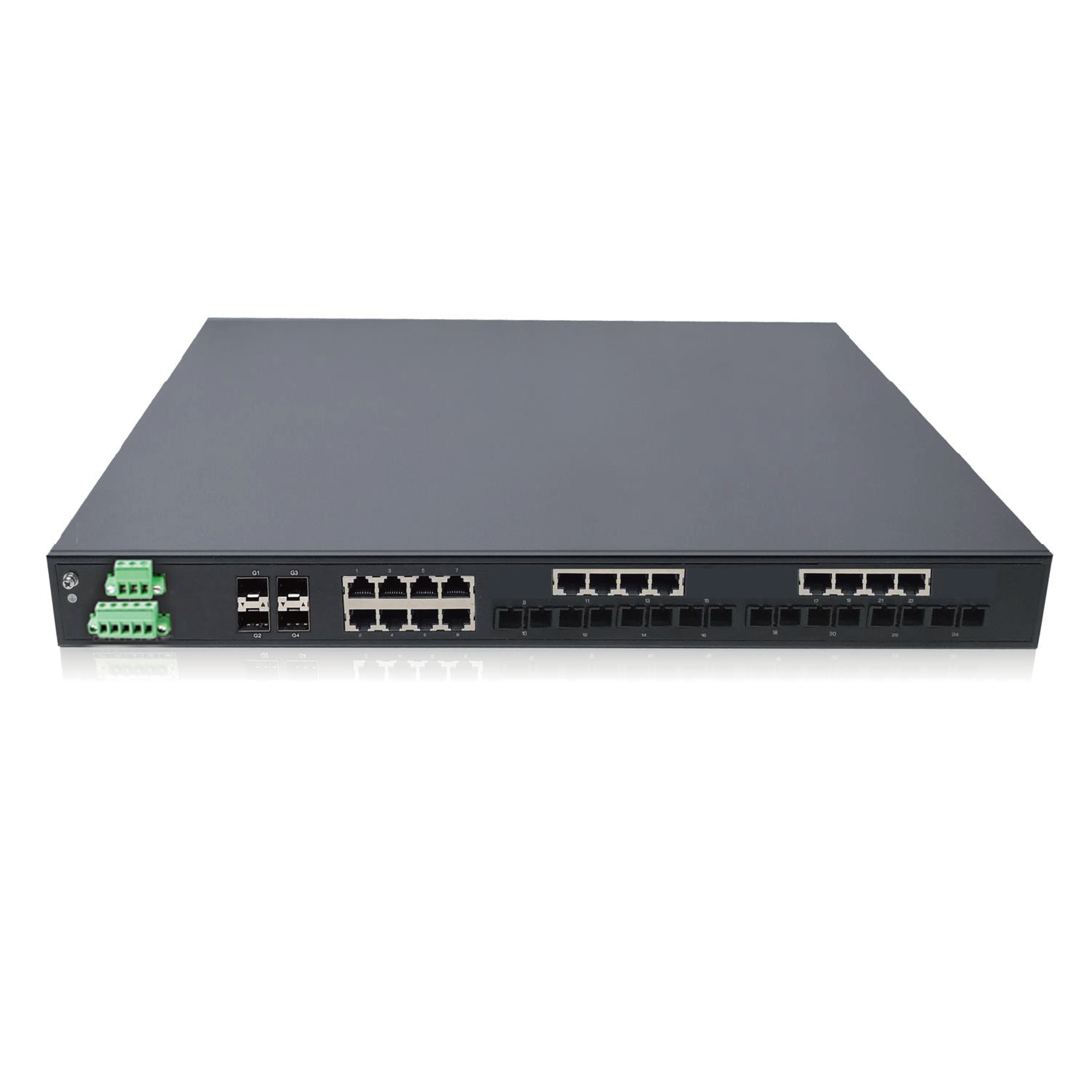 28端口工业以太网交换机,带 4个千兆光口,16个百兆光口和8百兆电口
