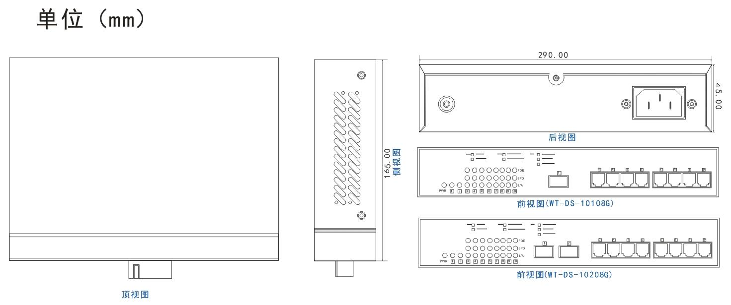 外壳:IP30防护等级,金属外壳 尺寸:290mm*165mm*45mm 重量:600g 安装方式:桌面式/壁挂式 |