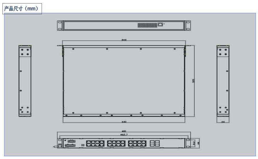 外壳 : 金属,IP40防护 尺寸 : 440x320x 44 mm 重量 : 3100g 安装方式 : 机架式安装 |